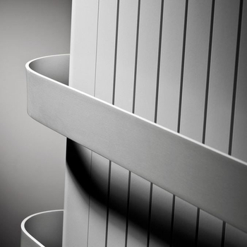 ALU-ZEN to dekoracyjny grzejnik aluminiowy, płaska bryła z zaokrąglonymi bokami. Front grzejnika jest złożony z paneli przedzielonych delikatnymi pionowymi rowkami