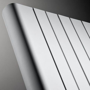 ALU-ZEN to dekoracyjny grzejnik aluminiowy, płaska bryła z zaokrąglonymi bokami. Front grzejnika jest złożony z paneli przedzielonych delikatnymi pionowymi rowkami