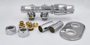 Zestaw „Twins” do grzejników z połączeniem dolnym i króćcami o rozstawie 50 mm.