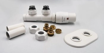 Zestaw „Twins” do grzejników z połączeniem dolnym i króćcami o rozstawie 50 mm.