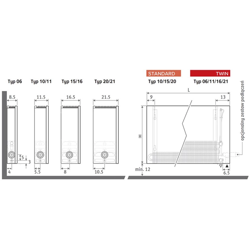 - częściowo zmontowana obudowa z lewym lub prawym podłączeniem u dołu grzejnika
