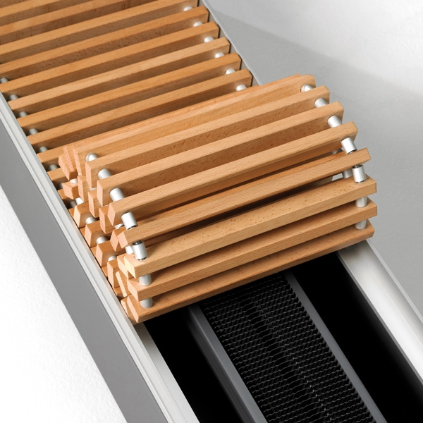 Idealne rozwiązanie do pomieszczeń z wysokimi oknami, oranżerii i biur. Pod kratką ukryty jest szybko reagujący system Low-H2O. Jedynym widocznym elementem grzejnika w pomieszczeniu jest estetyczna kratka przykrywająca, którą można idealnie dopasować do podłogi lub wystroju wnętrza.
