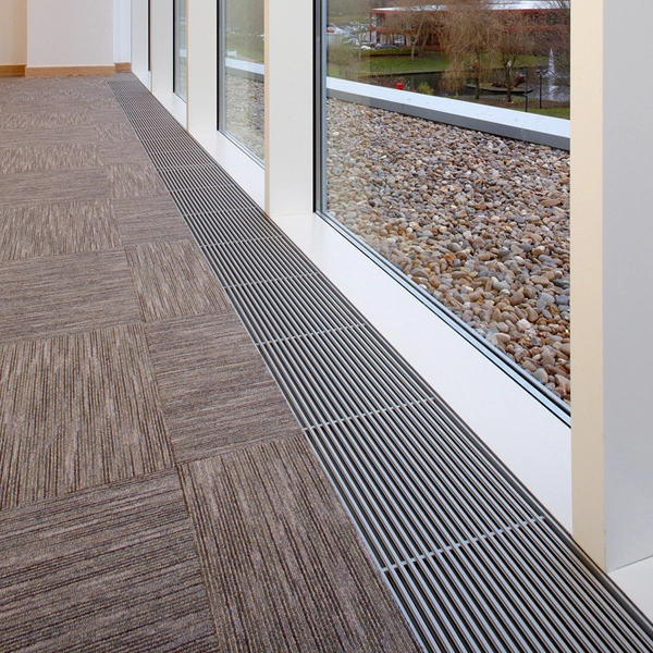 Idealne rozwiązanie do pomieszczeń z wysokimi oknami, oranżerii i biur. Pod kratką ukryty jest szybko reagujący system Low-H2O. Jedynym widocznym elementem grzejnika w pomieszczeniu jest estetyczna kratka przykrywająca, którą można idealnie dopasować do podłogi lub wystroju wnętrza.