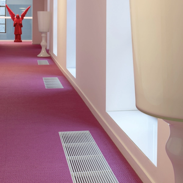 Idealne rozwiązanie do pomieszczeń z wysokimi oknami, oranżerii i biur. Pod kratką ukryty jest szybko reagujący system Low-H2O. Jedynym widocznym elementem grzejnika w pomieszczeniu jest estetyczna kratka przykrywająca, którą można idealnie dopasować do podłogi lub wystroju wnętrza.
