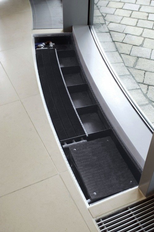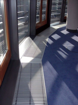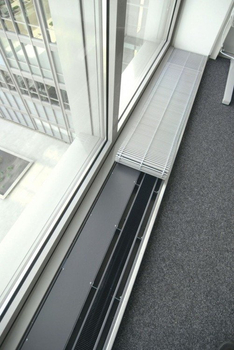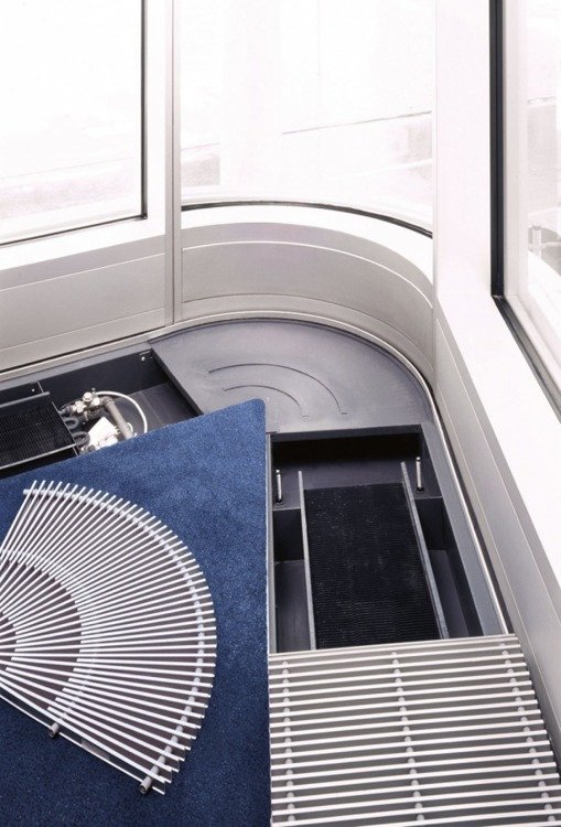 Urządzenia Katherm NK montowane są na odpowiedniej wysokości w posadzkach i podłogach podwójnych przed fasadami okiennymi sięgającymi do podłogi. Wyróżniają się