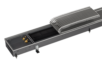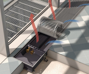 wysoką wydajnością również przy niskich temperaturach systemowych i nadają się nie tylko do skutecznego ekranowania zimnego powietrza i ogrzewania uzupełniającego, ale również do samodzielnego ogrzewania pomieszczenia. Działanie Chłodne powietrze opada do kanału podłogowego, przepływa pod ogrzewanym wodą konwektorem i obok niego, a po podgrzaniu wznosi się ponownie w kierunku powierzchni szyb. Ciepłe powietrze rozchodzi się w pomieszczeniu bez powodowania przeciągów, a po schłodzeniu opada znów ku podłodze, co zapewnia łagodną cyrkulację powietrza