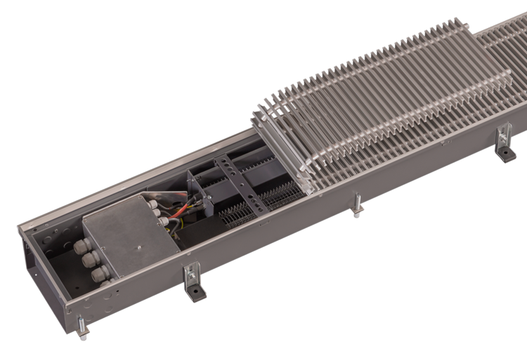 - Podłogowy kanał grzewczy z konwekcją wymuszoną wentylatorami poprzecznymi. Bez wody grzewczej, za to z grzejnikiem elektrycznym.